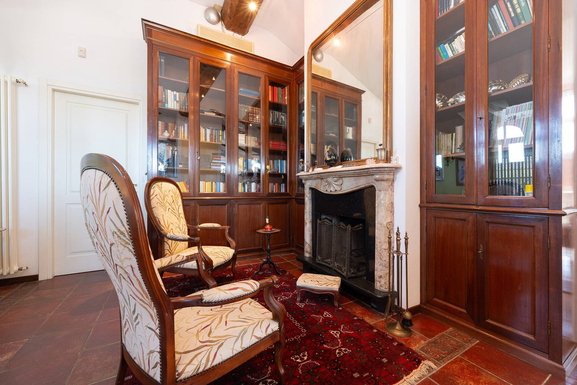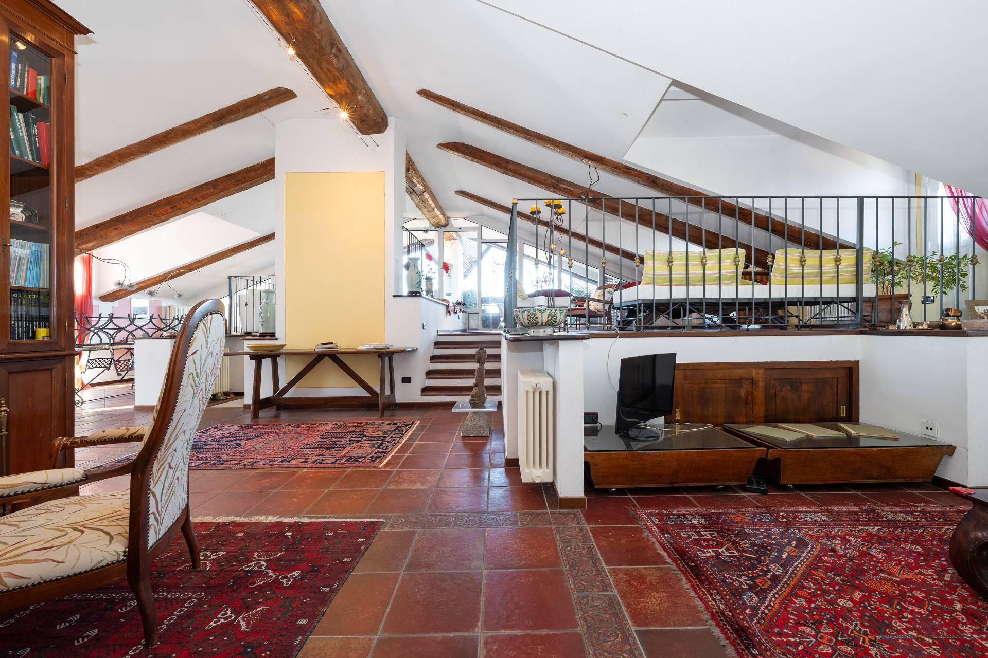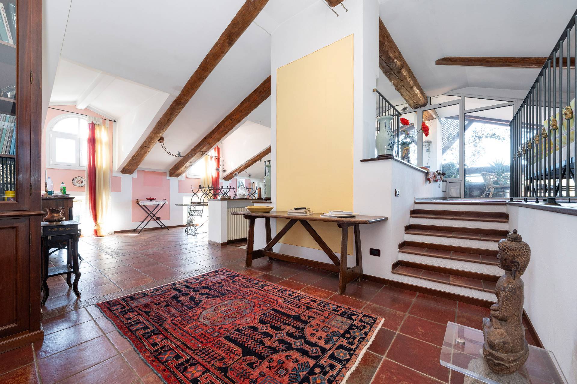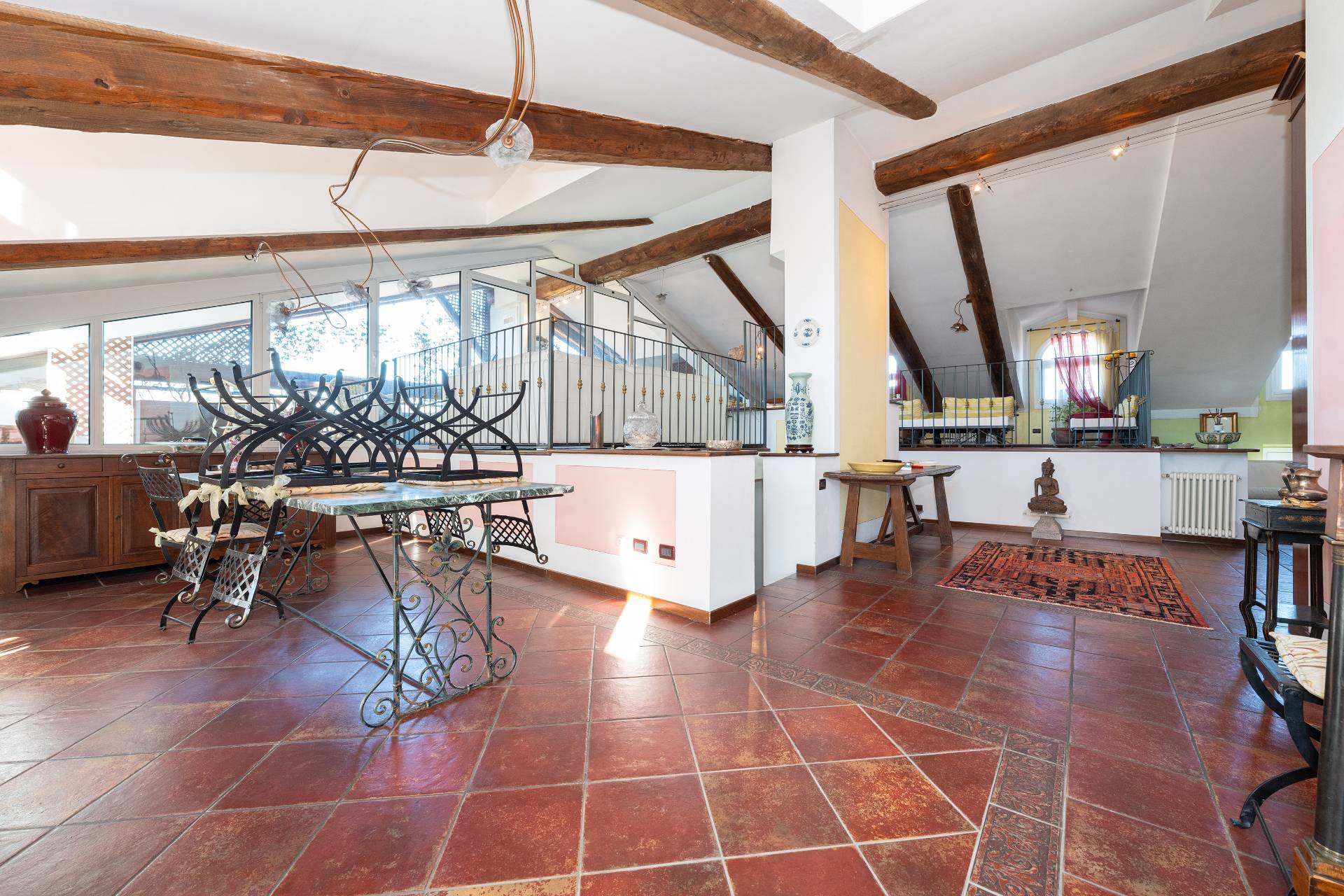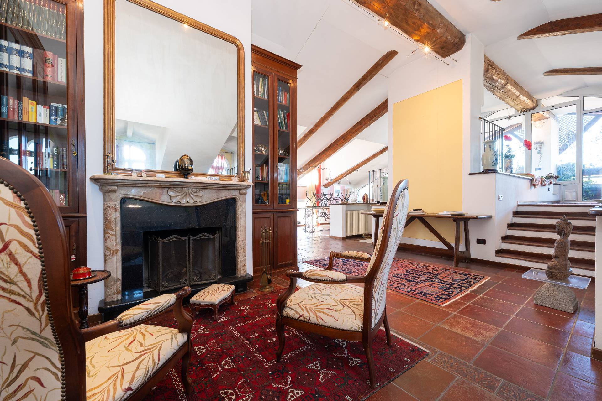 Un'elegante scala conduce al piano Attico, dove si apre una zona giorno di rappresentanza con salone doppio, sala da pranzo, area relax con camino d'epoca funzionante, cucina su misura e terrazzo coperto panoramico con splendida vista sulle montagne.