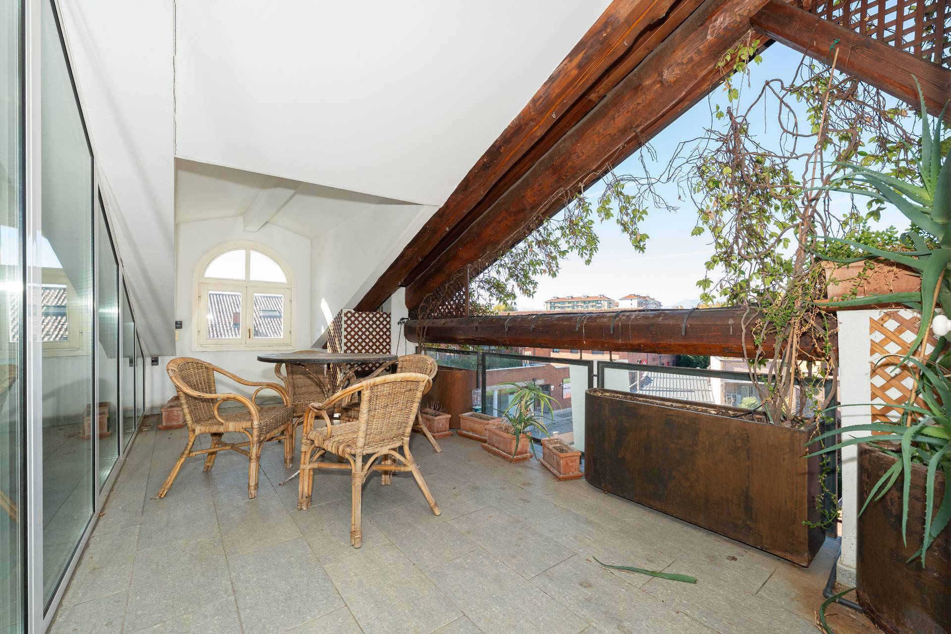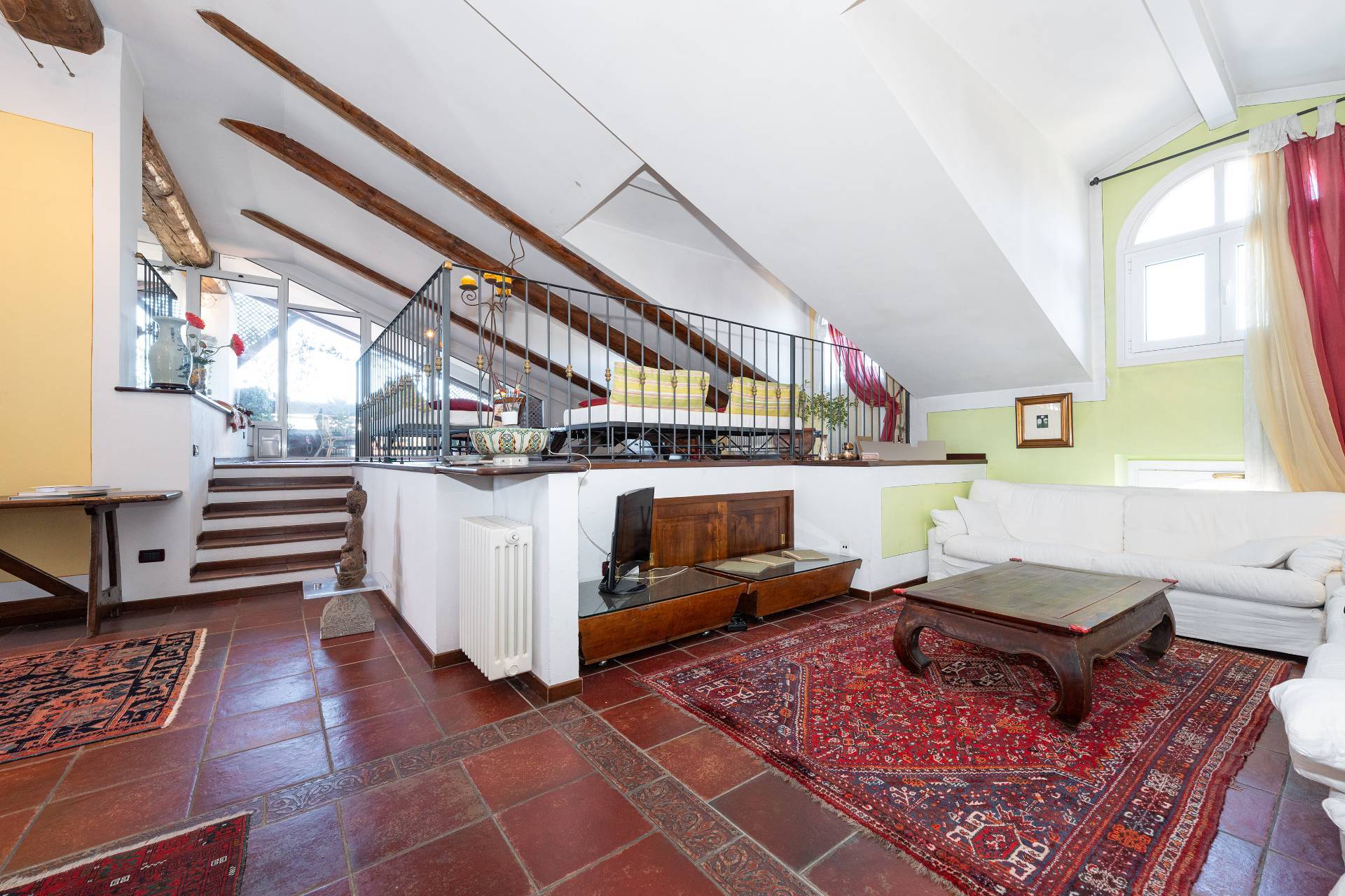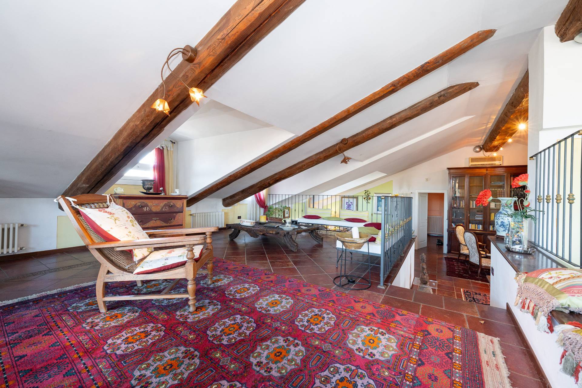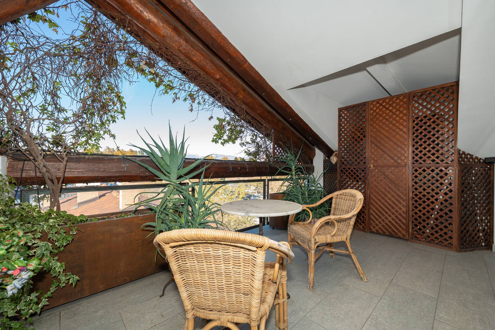 Un'elegante scala conduce al piano Attico, dove si apre una zona giorno di rappresentanza con salone doppio, sala da pranzo, area relax con camino d'epoca funzionante, cucina su misura e terrazzo coperto panoramico con splendida vista sulle montagne.