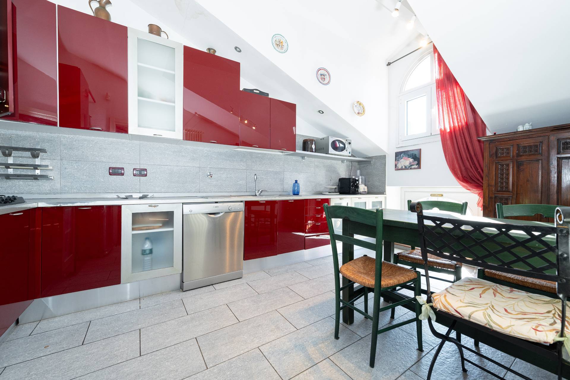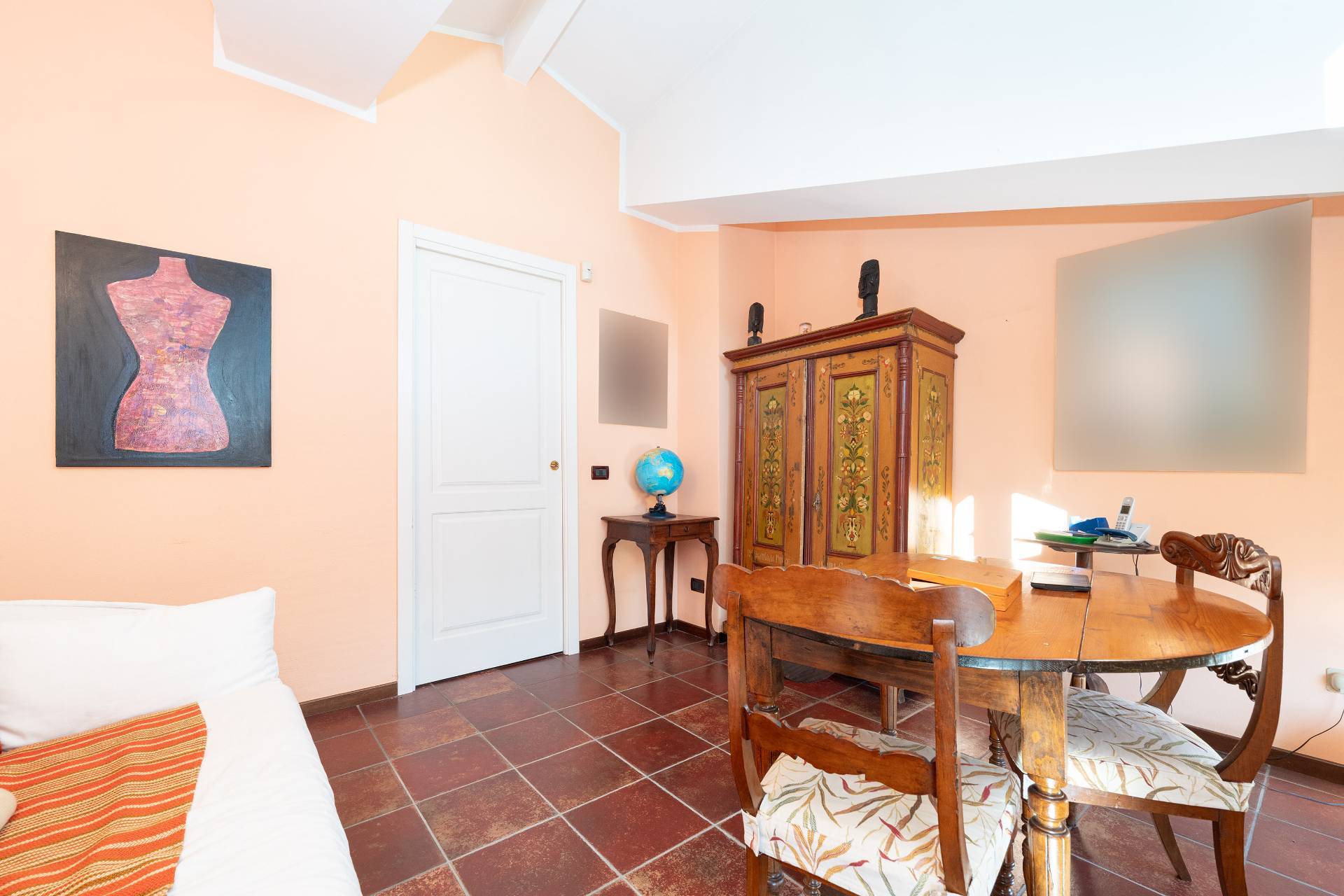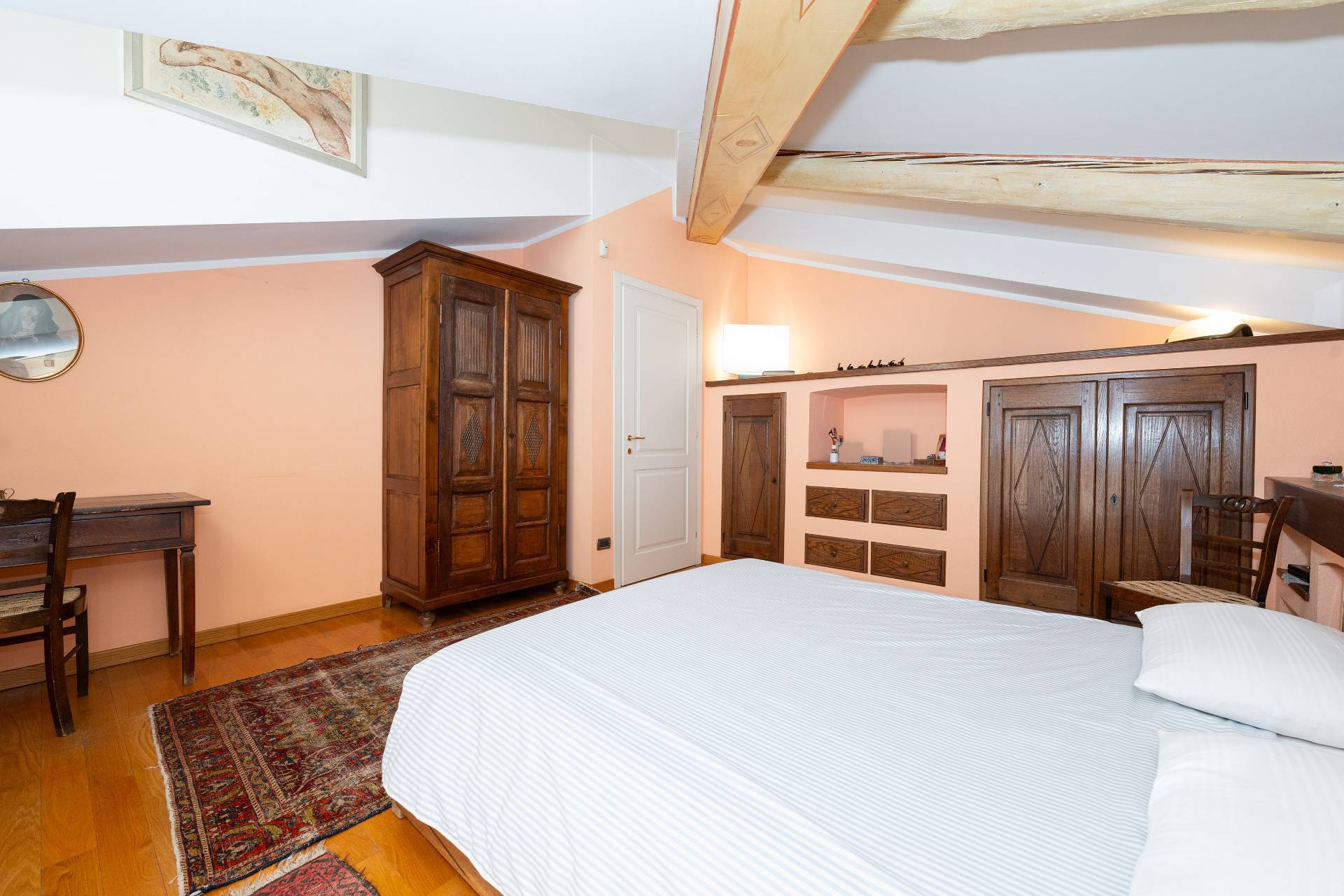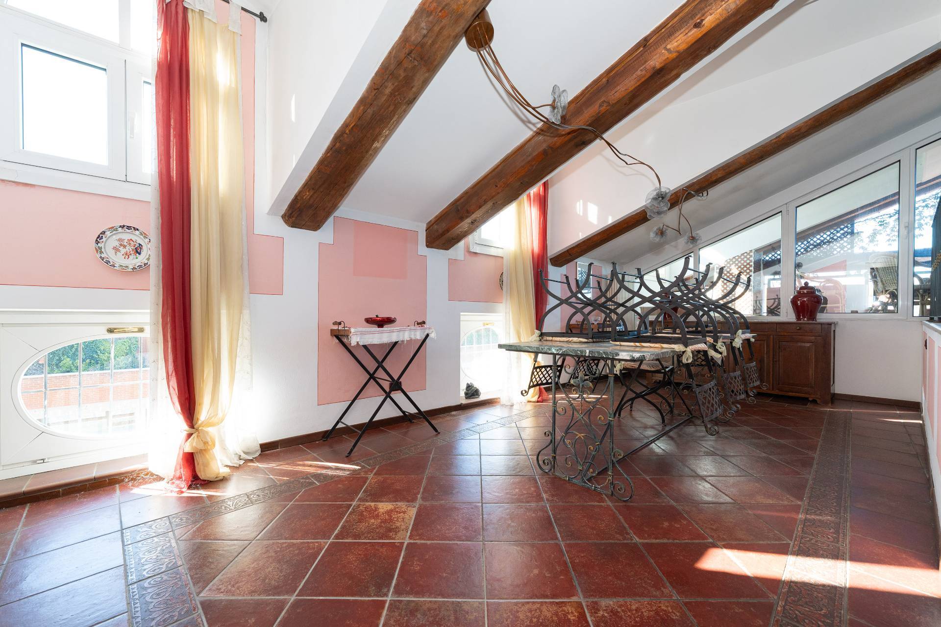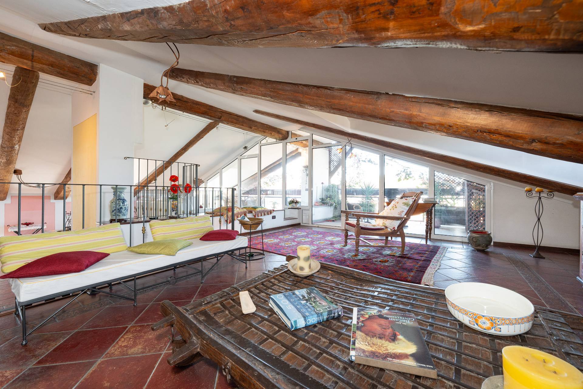 Un'elegante scala conduce al piano Attico, dove si apre una zona giorno di rappresentanza con salone doppio, sala da pranzo, area relax con camino d'epoca funzionante, cucina su misura e terrazzo coperto panoramico con splendida vista sulle montagne.